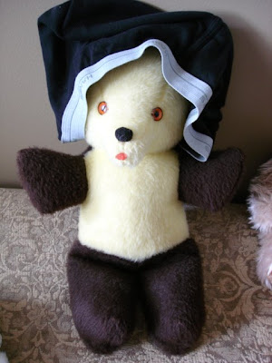 This is Bumblevee's Lion. She sez that he is kwite timid, an can be led astray by sum ov the cheekier Bears, like heer, for exampol. She thinks puttin those pants on his hed wassent his idea. I'm not so shor. I think he looks like he is ownly TRYIN to look innosent. He's enjoyin himself, reelly:
